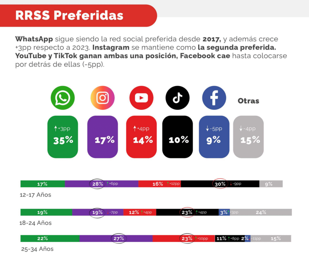 - Mujeres y jóvenes (18–24 años): prefieren Instagram y TikTok
